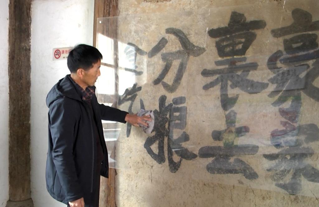 李云安正在擦拭保护红军标语的有机玻璃罩。秦姗 摄