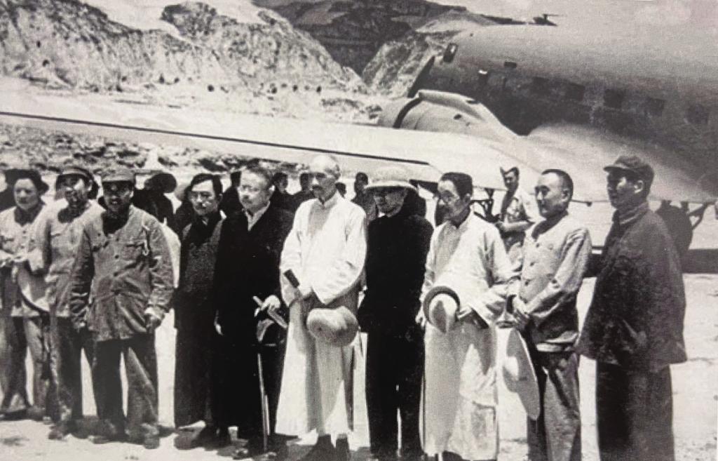 1945年7月,毛泽东等在延安机场迎接国民参议会议员,由此产生历史上著名的“窑洞对”。(资料照片)