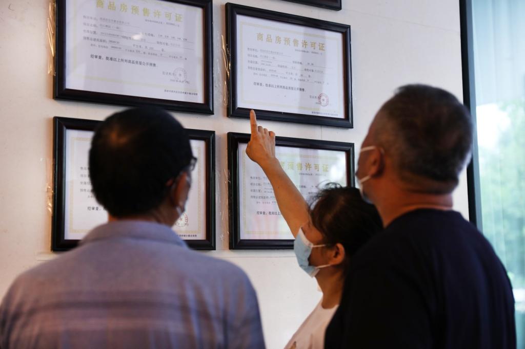 群众在江山臻境售楼中心看墙上悬挂的《商品房预售许可证》等“五证”。秦川儿 摄