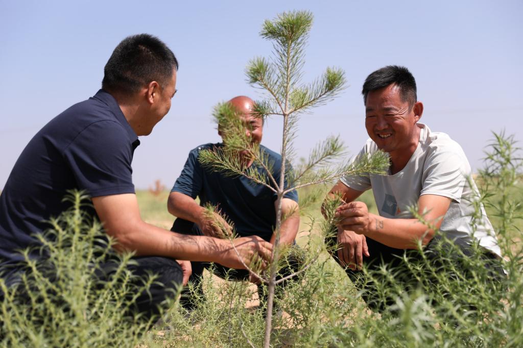 榆阳区波罗滩村党支部书记席有飞(右一)和村民共同造林防沙。秦川儿 摄