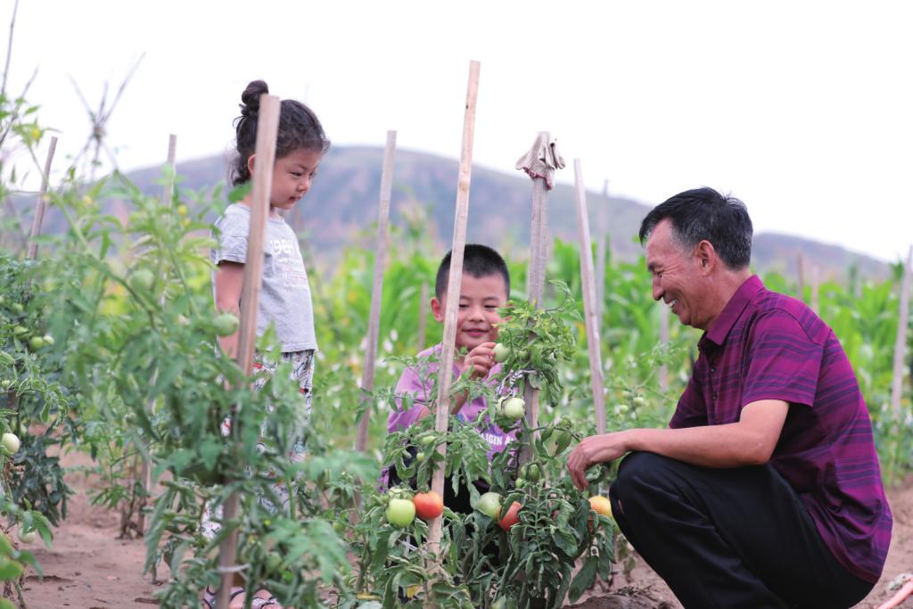 神木市打井沟村村民在自家门前的菜园里给孩子们摘西红柿。秦川儿 摄