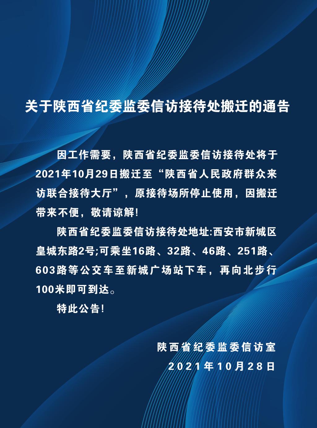 因工作需要,陕西省纪委监委信访接待处将于2021年10月29日搬迁至“陕西省人民政府群众来访联合接待大厅”,原接待场所停止使用,因搬迁带来不便,敬请谅解!