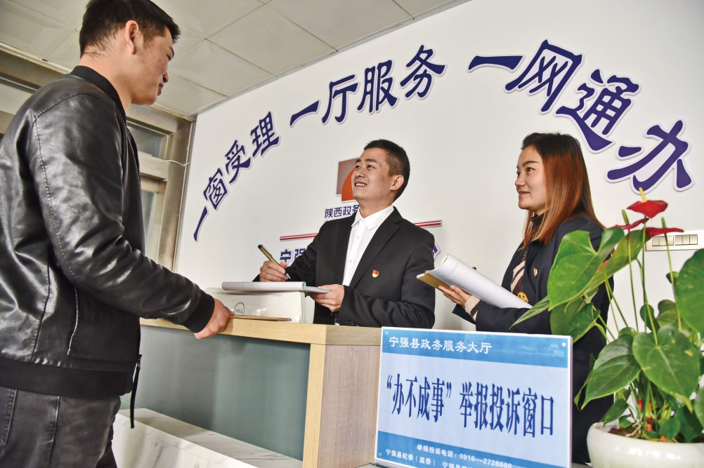 在陕西省宁强县政务服务大厅,“办不成事 ”举报投诉窗口尤为醒目。
