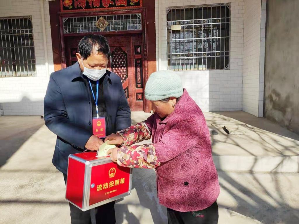 武功县第十八届人大代表选举期间设置在游凤镇游凤村的流动票箱,工作人员入户接受群众投票。朱盟盟 摄