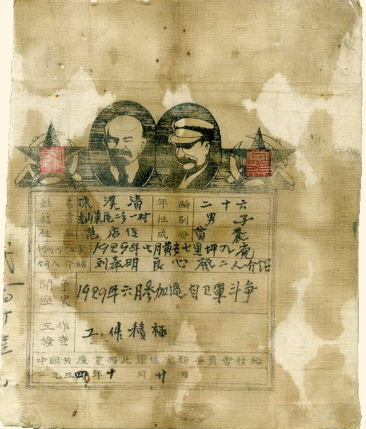 在河南信阳“鄂豫皖苏区首府革命博物馆”内,陈列着一张特殊的党证,上面沾满血渍,它的主人就是开国将帅之一的独臂将军陈波。党证布制,长方形,上方印有列宁和斯大林头像,下方写有持证人的姓名、参军入党时间、颁发单位及颁发时间等。这张党证是川陕苏区党组织颁发给“优秀共产党员”的首批党证中的一张,当时共颁发了2000张,陈波将军的这张是目前唯一保存下来的。