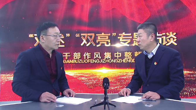 在专题访谈节目中,靖边县监委委员张宏(左)与县市场监管局局长石建斌(右)就群众关心的问题展开讨论。(靖边县纪委监委供图)