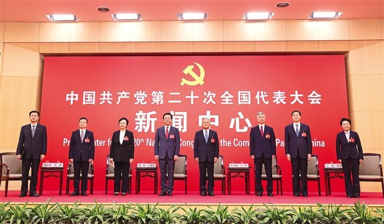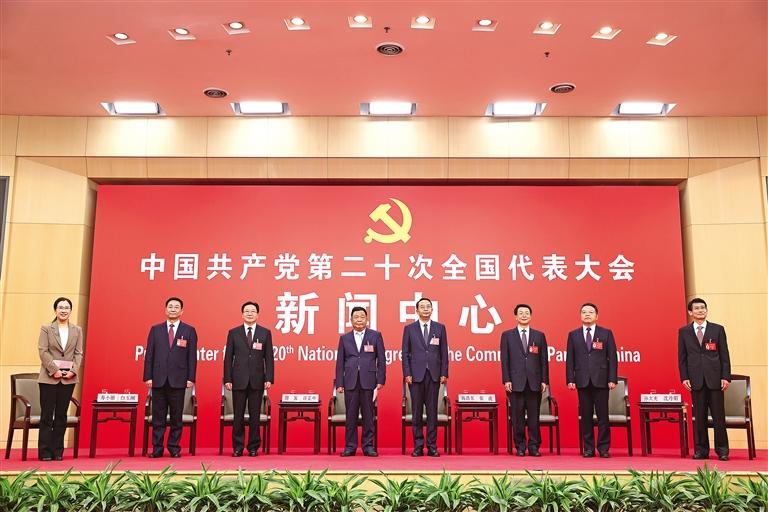 10月19日,中国共产党第二十次全国代表大会新闻中心举行集体采访。重庆、四川、贵州、云南、西藏、陕西、甘肃代表团新闻发言人出席,介绍代表团学习讨论二十大报告情况,并回答记者提问。新华社记者 陈建力摄