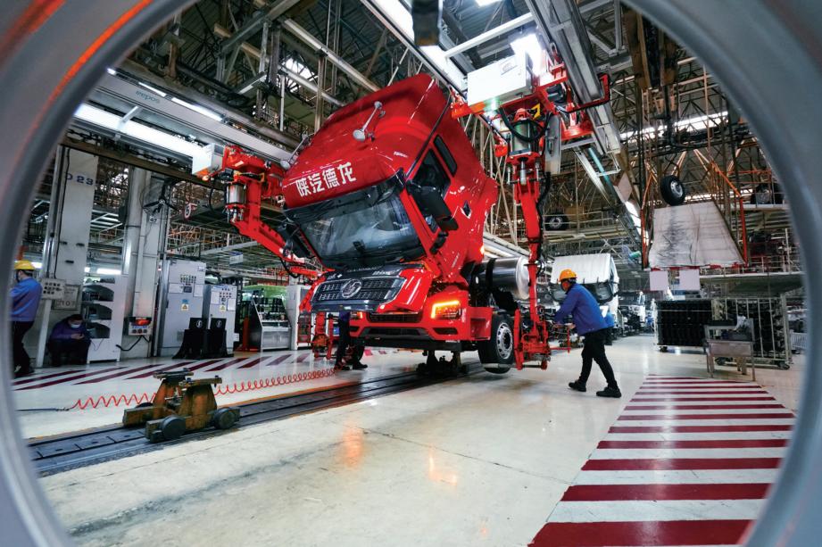 陕汽控股集团重卡生产线上即将下线的天然气重卡。谭永平 摄