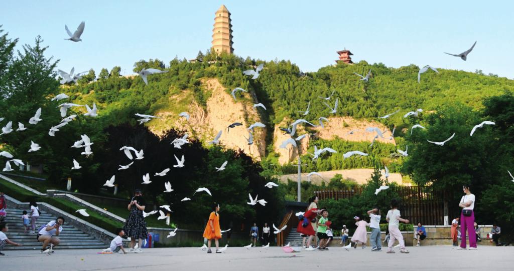 一群白鸽从延安宝塔山前飞过。王德荣 摄