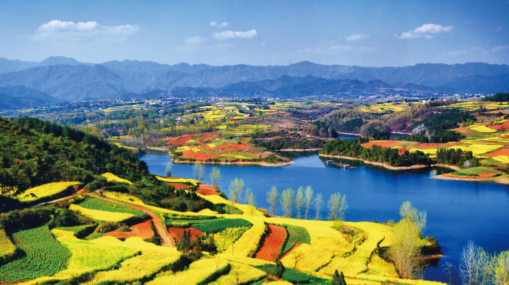 洋县傥河湖光山色观花点的油菜花海。夏永光 摄