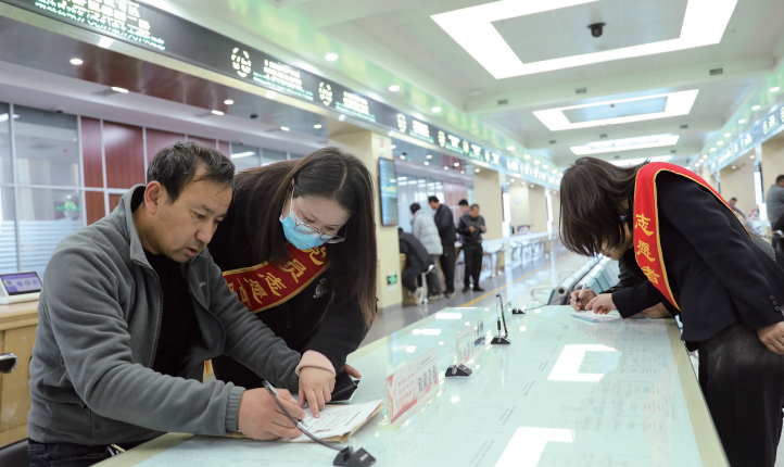 靖边县行政审批服务局政务服务中心工作人员正在帮助办事群众填写相关表格。武利芳 摄