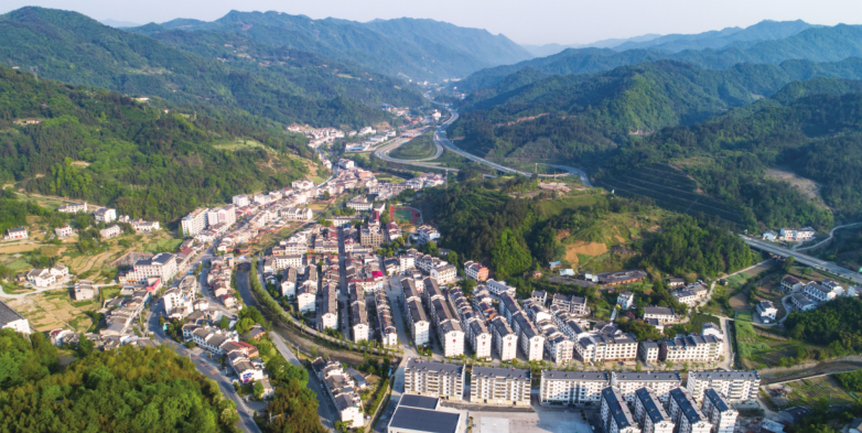 从空中俯瞰,陕西省平利县老县镇被苍翠的群山包围,县河潺潺流过,这里是秦巴山区一片难得的平地。