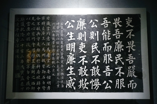 周萍:三秦大地,名碑荟萃。西安碑林博物馆的馆藏文物有13000多件,其中体现廉洁思想的碑刻更是不胜枚举。其中,刻于清道光四年的官箴碑最具代表性。这方石碑高83厘米,宽209厘米,集三十六字《官箴》、明泰安知州顾景祥跋语、清代的颜希深祖孙三代及长安知县张聪贤的跋语于一碑,可谓一部“公廉”《官箴》的流传史。三十六字《官箴》为“吏不畏吾严,而畏吾廉;民不服吾能,而服吾公。公则民不敢慢,廉则吏不敢欺,公生明,廉生威”。短小精悍而意蕴深远,道出了为官从政在于廉、在于公这个基本准则,对为官者具有极强的教育意义。直至今日,这三十六字《官箴》仍是许多为官者的座右铭,提醒着为官者要时刻保持廉洁自律,多为人民群众办实事、办好事。