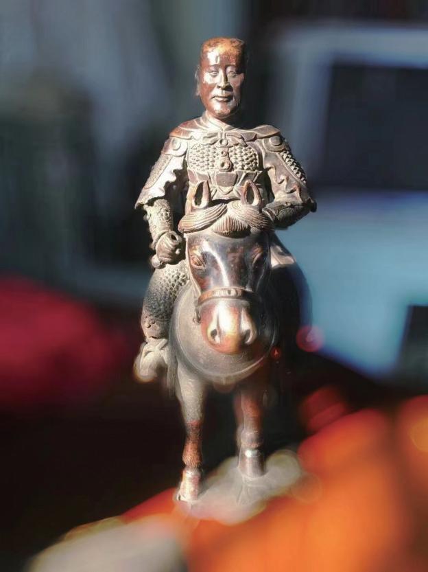 在陕西省神木市的郝家大院里,珍藏着一尊清代铸造的铜将军像。铜像上的将军身穿厚厚的盔甲,威风凛凛地骑在战马上,一手拉着缰绳,神态坚毅,目视前方。那匹战马两耳直竖,鬃毛飘逸,尽显风姿,马的尾巴上还吊着一个饭罐。