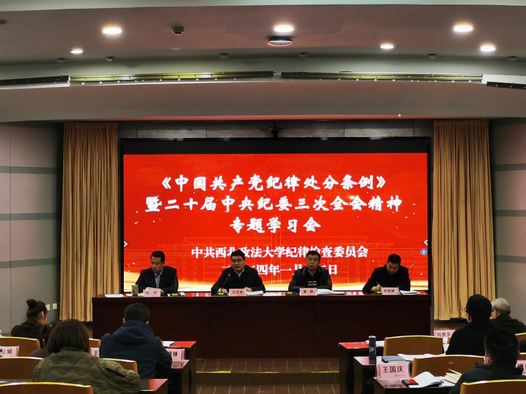 近日,《中国共产党纪律处分条例》(以下简称《条例》)修订印发,二十届中央纪委三次全会(以下简称三次全会)胜利召开。西北政法大学纪委高度重视,把学习好宣传好贯彻好《条例》和三次全会精神作为开年的第一项重要政治任务,作为捍卫“两个确立”、做到“两个维护”的重要政治检验,迅速行动,周密部署,多措并举推动学习宣传贯彻《条例》和三次全会精神走深走实,为学校事业高质量发展提供坚强纪律保证。