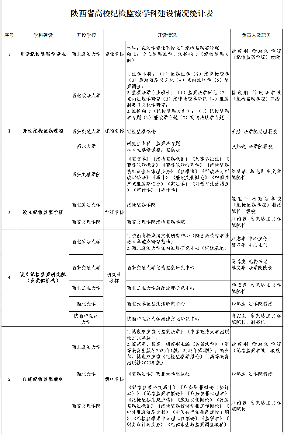 通过对在陕35所高校纪检监察学科建设情况进行调研摸排,详细了解开设纪检监察学科的6所高校具体情况。目前开设纪检监察学专业的院校有1所(西北政法大学),开设纪检监察课程的院校有4所(西北政法大学、西安交通大学、西北大学、西安文理学院),设立纪检监察学院的院校有2所(西北政法大学、西安文理学院),设立纪检监察研究院(及类似机构)的院校有5所(西北政法大学、西安交通大学、西北工业大学、西北大学、陕西中医药大学),自编纪检监察教材的院校有3所(西北政法大学、西北大学、西安文理学院)。现将具体情况汇报如下。