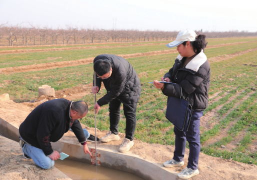 合阳县抽黄管理处水费廉政巡查组工作人员在春灌期间,开展水量测量工作。秦川儿 摄