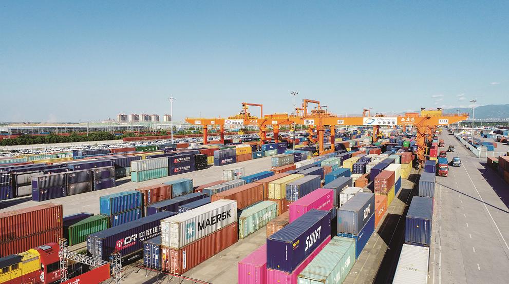 走进位于西安浐灞国际港的哈萨克斯坦西安码头,现场一片繁忙,巨型门机腾挪转移,一件件货物稳稳落进集装箱,即将搭乘中欧班列踏上“出海”之旅。