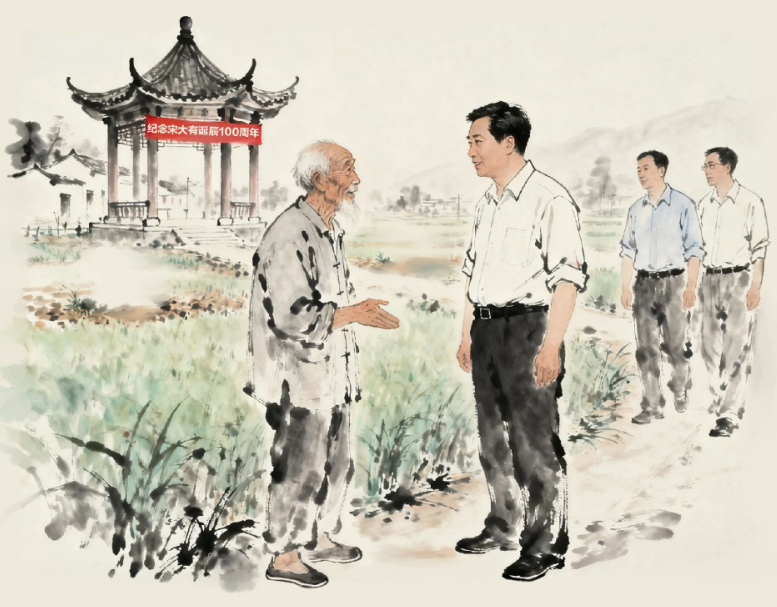 几天后,局里组织干部考察乡村振兴项目,路过一个村庄时,村口一条“百年风雨践初心,一生奋斗映征程——纪念宋大有诞辰100周年”的横幅引起了大家的注意。