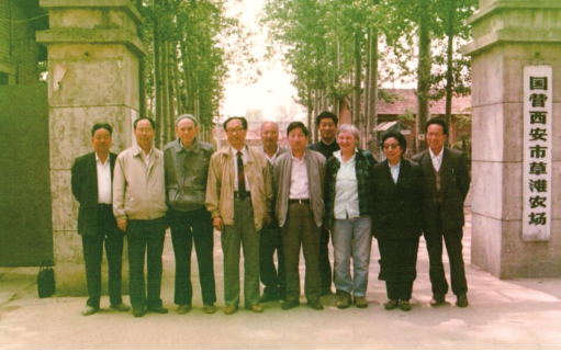 1993年,西安市农垦局、草滩农场党政领导和阳早(左三)、寒春(右三)在草滩农场机关门口合影。(西安草滩集团有限公司供图)