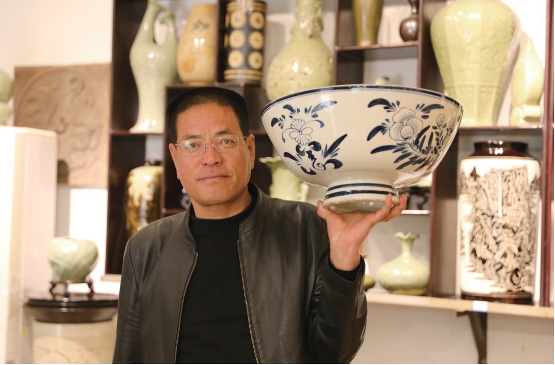 耀州瓷第六代传承人王战军展示刚出窑的兰花白底大老碗。秦川儿 摄