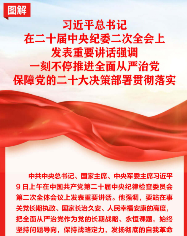 中共中央总书记、国家主席、中央军委主席习近平9日上午在中国共产党第二十届中央纪律检查委员会第二次全体会议上发表重要讲话。他强调,要站在事关党长期执政、国家长治久安、人民幸福安康的高度,把全面从严治党作为党的长期战略、永恒课题,始终坚持问题导向,保持战略定力,发扬彻底的自我革命精神,永远吹冲锋号,把严的基调、严的措施、严的氛围长期坚持下去,把党的伟大自我革命进行到底。要坚持严管和厚爱结合、激励和约束并重,坚持“三个区分开来”,更好激发广大党员、干部的积极性、主动性、创造性,形成奋进新征程、建功新时代的浓厚氛围和生动局面。