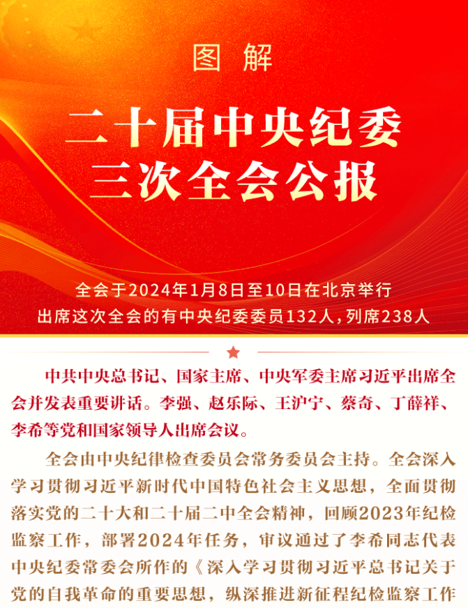 中共中央总书记、国家主席、中央军委主席习近平8日上午在中国共产党第二十届中央纪律检查委员会第三次全体会议上发表重要讲话。他强调,经过新时代十年坚持不懈的强力反腐,反腐败斗争取得压倒性胜利并全面巩固,但形势依然严峻复杂。我们对反腐败斗争的新情况新动向要有清醒认识,对腐败问题产生的土壤和条件要有清醒认识,以永远在路上的坚韧和执着,精准发力、持续发力,坚决打赢反腐败斗争攻坚战持久战。