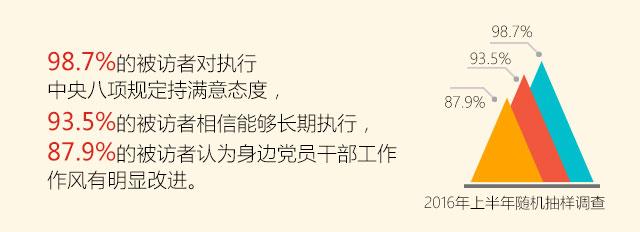省委省政府高度重视,坚持向中央基准看齐,把贯彻落实中央八项规定精神作为全面从严治党的重要内容和抓手。省委常委会作出反对“四风”十项承诺,欢迎社会监督。围绕习近平总书记系列重要讲话精神和中央加强作风建设的新规定新要求,省委常委会第一时间认真学习,多次研究部署。省委常委班子成员以身作则,严守中省各项纪律规定,认真落实作风建设主体责任,带动形成以上率下、层层示范的生动局面。在改进调查研究方面,更加注重突出主题和内容,更多到基层一线、贫困山区和困难较大、矛盾集中、群众意见多的地方,简化公务接待,从简安排食宿,直接走访干部群众;坚持轻车简从,严格执行住宿、用餐、陪同人员等方面的规定,到基层廉政灶用餐。在精简会议活动和文件简报方面,更加注重统筹协调、从严审批,严格控制会议规模和发文数量,提高效率和质量;实行简报内刊注册许可制度,报送省委、省政府的简报种类减少32种、总期数减少38.1%。在严格文稿发表和改进新闻报道方面,省级领导同志没有违反规定公开出版著作,没有出现未经批准为有关部门或个人作序、题词题字、发贺电贺信的情况;严格控制一般性会议活动新闻报道及其篇幅,省级领导同志新闻报道的数量、篇幅、时长同比均显著减少。在规范生活待遇及秘书配备和管理方面,强调过紧日子,工作生活待遇就低不就高,严格执行省部级领导干部秘书管理规定。在省委常委会的带动下,全省各地各部门认真贯彻落实中央八项规定成为常态。据省统计局2016年上半年随机抽样调查,98.7%的被访者对执行中央八项规定持满意态度,93.5%的被访者相信能够长期执行,87.9%的被访者认为身边党员干部工作作风有明显改进。