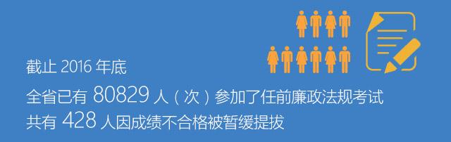 知纪明纪,方能敬纪守纪。省纪委把领导干部任前廉政法规考试制度作为党章党规党纪教育的硬措施,坚持“凡提必考、以考促学、以学促廉”,不断健全相关规定,及时更新考试内容,着力提升考廉效果,截止2016年底,全省已有80829人(次)参加了任前廉政法规考试,共有428人因成绩不合格被暂缓提拔。我省考廉制度得到中央纪委的充分肯定,做法被《人民日报》、中央纪委网站等多家媒体多次刊发转载。