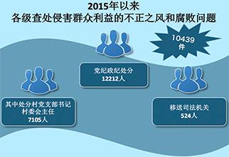 坚决查处“小官巨贪”。严肃查处西安市雁塔区丈八街道东滩社区居委会主任于凡、渭南市住建局建管科原科长侯福才等一批典型案件,在社会上引起强烈反响。2015年以来,各级查处侵害群众利益的不正之风和腐败问题10439件;党纪政纪处分12212人,其中处分村党支部书记、村委会主任7105人;移送司法机关524人。开展扶贫领域突出问题专项整治,严肃查处挪用救济物资、截留私分扶贫款、优亲厚友,虚报冒领扶贫资金等问题。2015年以来,全省查处扶贫领域违纪违法问题2080件,党纪政纪处分2480人。